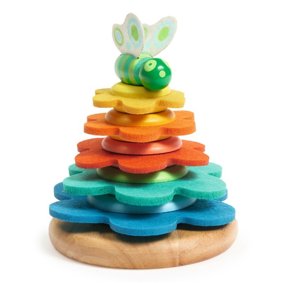 Lo que hace especial a Butterflower es la combinación de texturas entre madera y fieltro, perfecta para manitas curiosas. Los peques se divertirán apilando los anillos de mayor a menor, ¡y se llevarán una sorpresa oculta bajo el anillo más grande!
