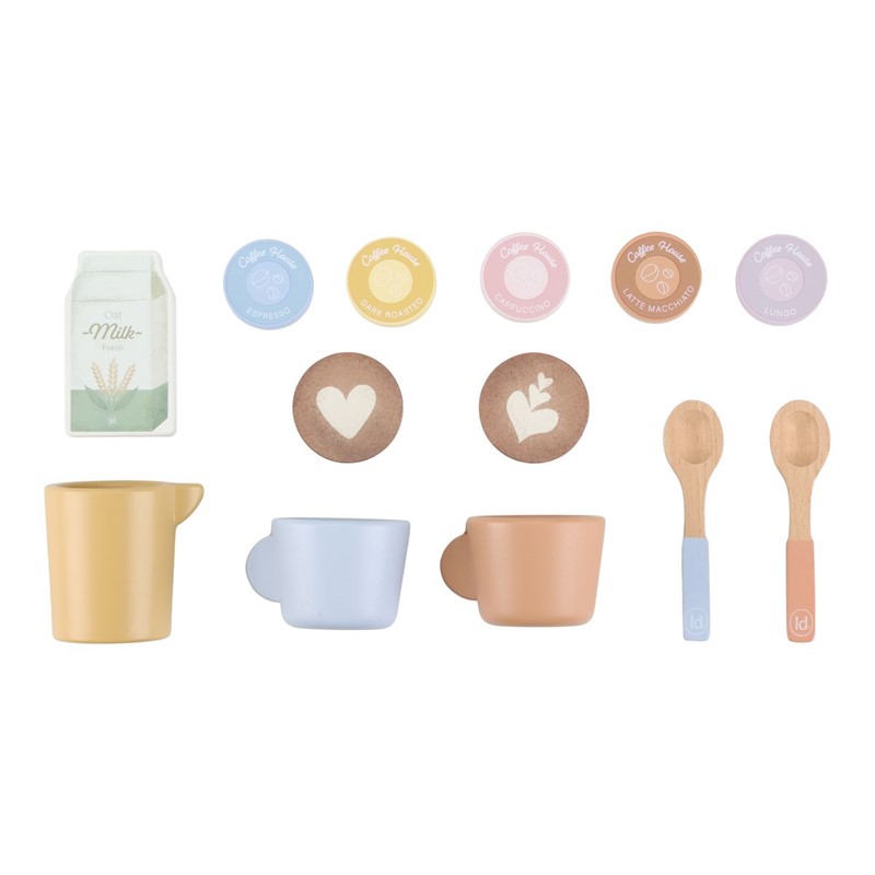 ¡Hora de una deliciosa taza de café o té! Con esta cafetera de madera, los pequeños baristas pueden moler granos, insertar cápsulas de café y remover su bebida con una cuchara. El set incluye dos tazas, dos cucharas, una jarra de leche, cartones de leche e incluso plantillas de capuchino para una auténtica experiencia de café. La parte trasera de la máquina presenta alegres ilustraciones. ¡Perfecta para combinar con el rincón de juego de café y divertirse aún más! ¿Hoy será café o té?