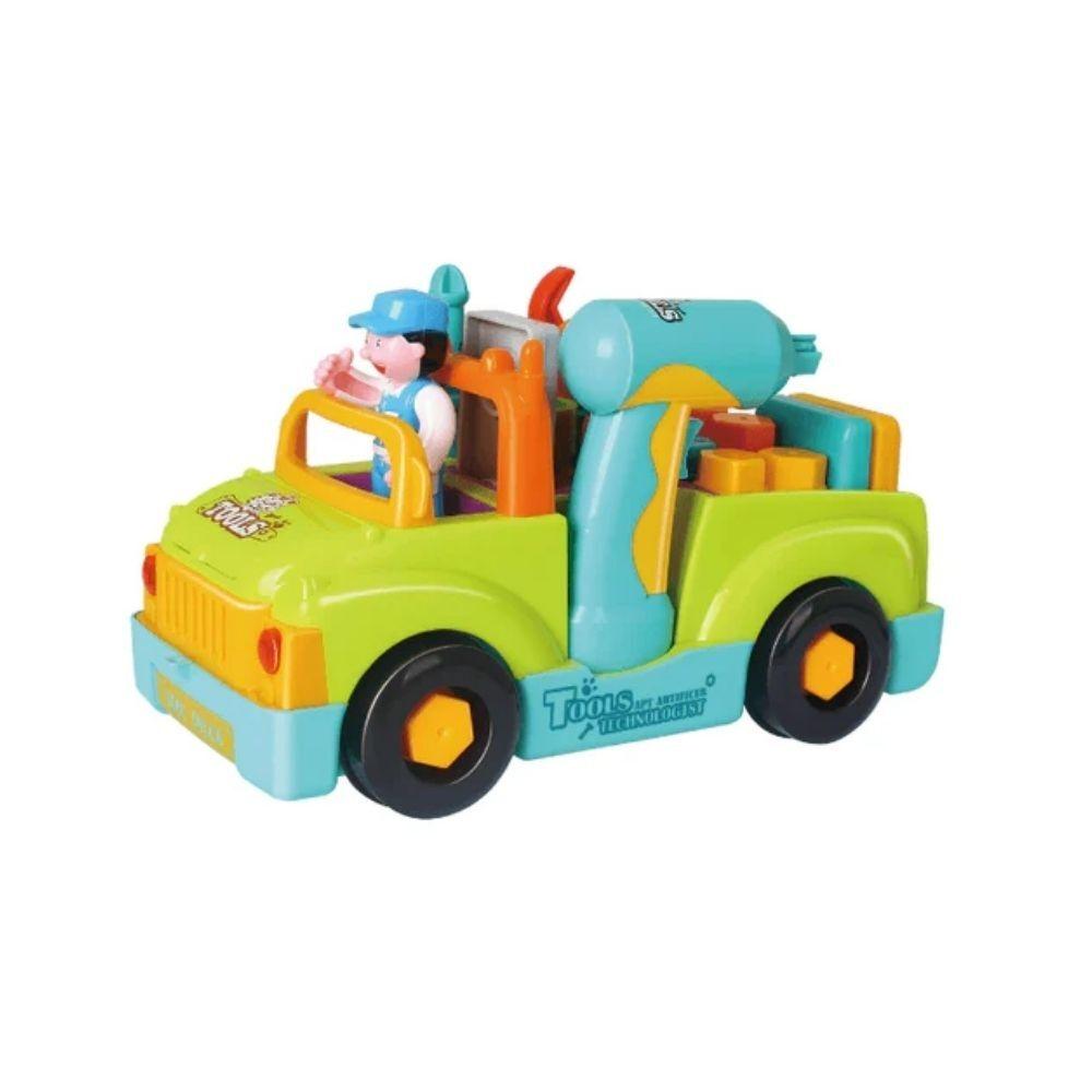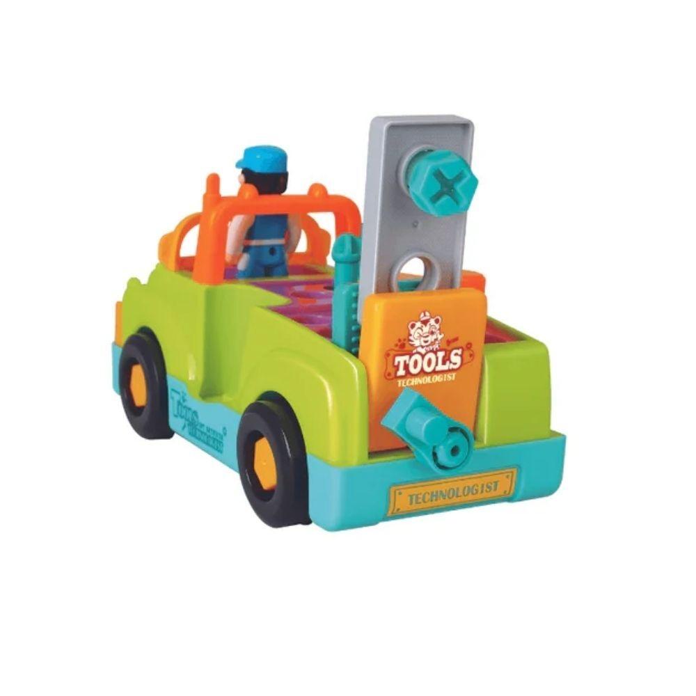Integra camión, banco de trabajo y un taladro eléctrico funcional con brocas intercambiables, pensado para que los peques manipulen, encajen y exploren de forma activa. Incorpora luces y música con botón on/off, además de función de choque y arranque: al chocar, el camión cambia automáticamente de dirección, reforzando el aprendizaje causa-efecto.