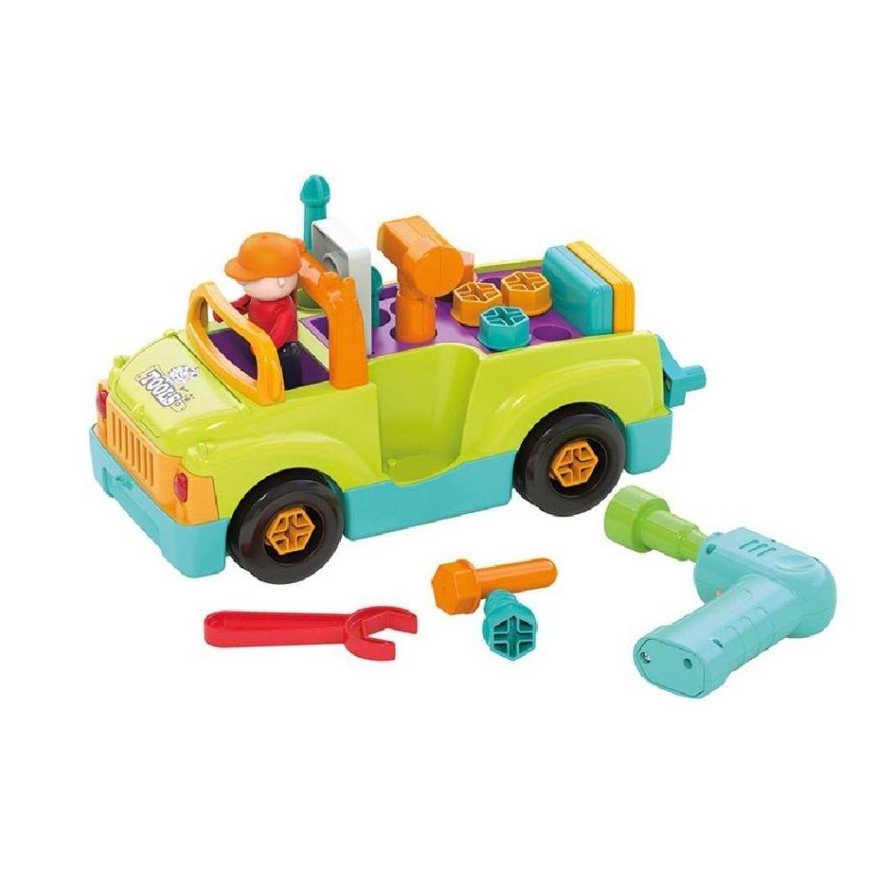 Integra camión, banco de trabajo y un taladro eléctrico funcional con brocas intercambiables, pensado para que los peques manipulen, encajen y exploren de forma activa. Incorpora luces y música con botón on/off, además de función de choque y arranque: al chocar, el camión cambia automáticamente de dirección, reforzando el aprendizaje causa-efecto.