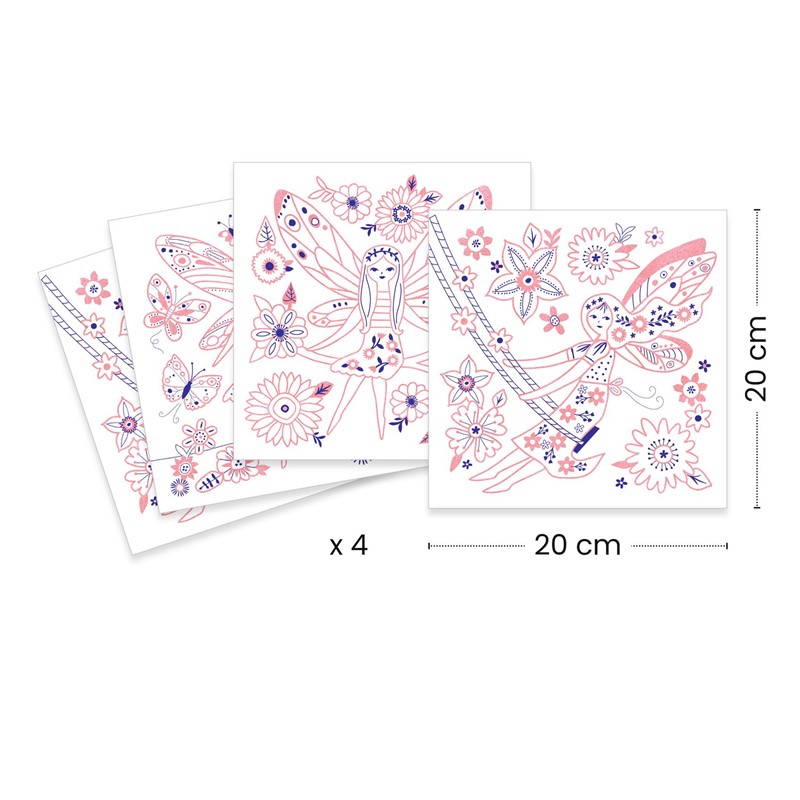 ¡Descubre un mundo mágico de hadas con estas encantadoras láminas para colorear! Este set incluye 4 hermosas fichas ilustradas de 20×20 cm, decoradas con elegantes detalles dorados que harán volar la imaginación de los pequeños artistas.