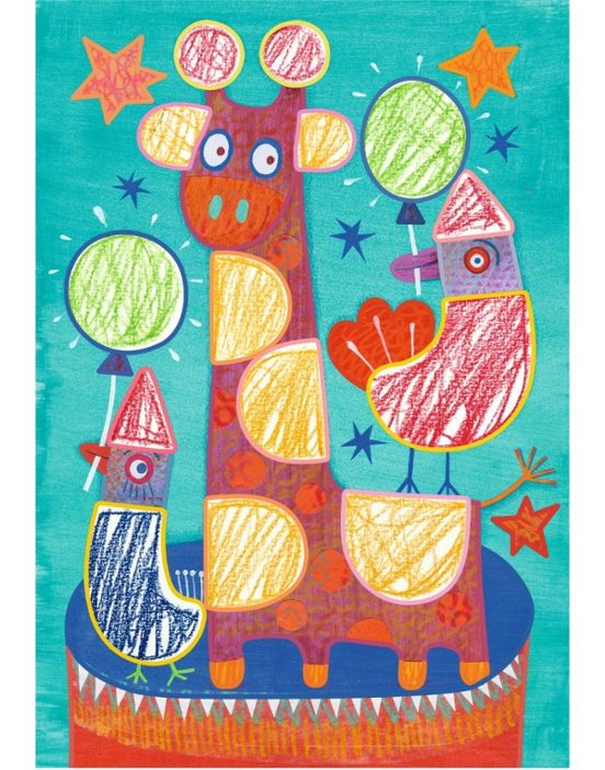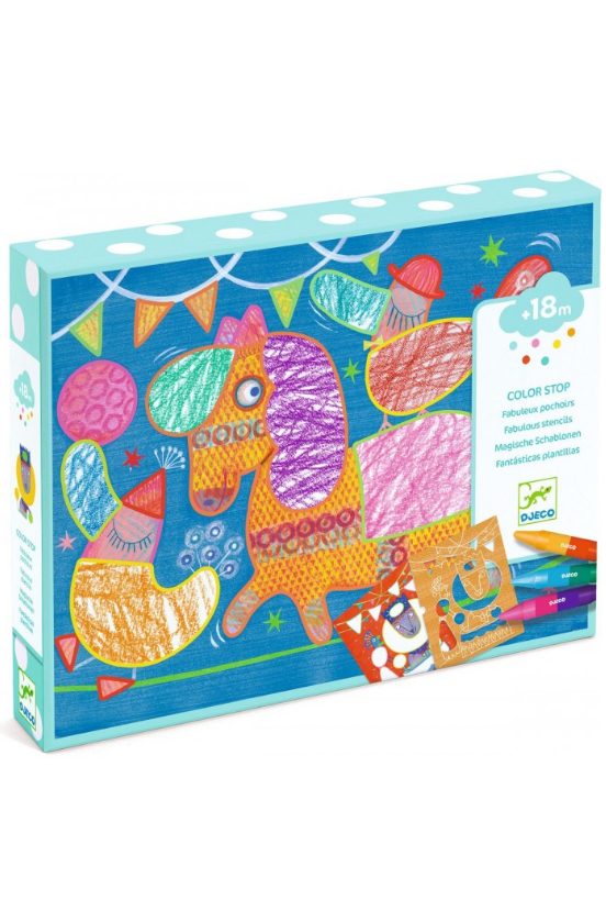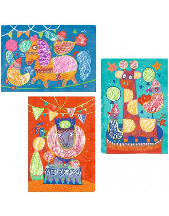 Con 12 tarjetas ilustradas de gran tamaño, 3 plantillas resistentes y 3 ceras de doble cara (¡6 colores diferentes!), los niños podrán garabatear y crear bonitas imágenes de forma segura y divertida.