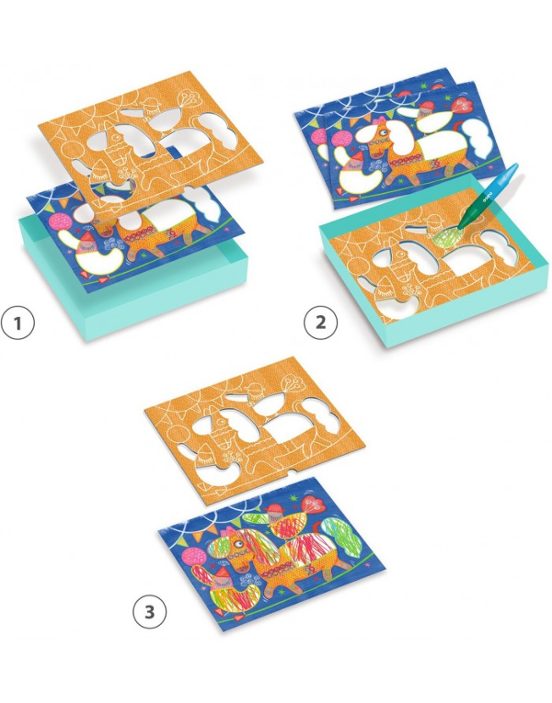 El diseño está pensado para facilitar su uso: las láminas y plantillas se ajustan perfectamente a la base, evitando que se muevan mientras colorean. Incluye una guía ilustrada para padres que hace la experiencia aún más enriquecedora.