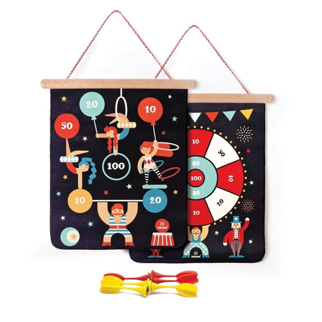 El tablero doble cara presenta un colorido mundo circense que encantará a pequeños y grandes. Los 6 dardos magnéticos, totalmente seguros, permiten disfrutar sin preocupaciones mientras desarrollan la precisión y coordinación.