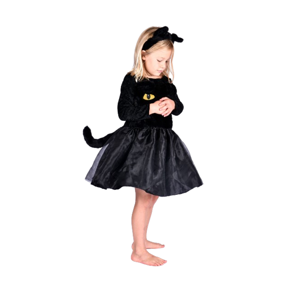 Este conjunto en negro combina estilo y comodidad con una falda de tul que incluye una adorable cola de gato. La parte superior, confeccionada en suave terciopelo de manga larga, destaca por unos llamativos ojos amarillos y orejas negras que le dan ese toque felino irresistible. Para completar el look, incluye una diadema con orejas de gato a juego.
