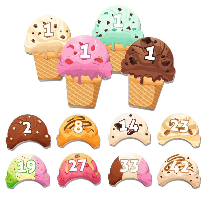 Cada jugador empieza con 1 cono y 1 bola de helado. Las demás bolas están numeradas del 2 al 49 y se colocan bocabajo en la mesa.