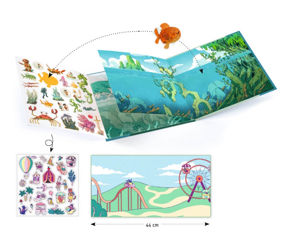¡Descubre un mundo submarino lleno de diversión! Este fantástico estuche rígido es perfecto para pequeños exploradores creativos. Incluye dos espectaculares panoramas del fondo marino de 44 cm y más de 50 pegatinas reutilizables para crear historias sin fin.