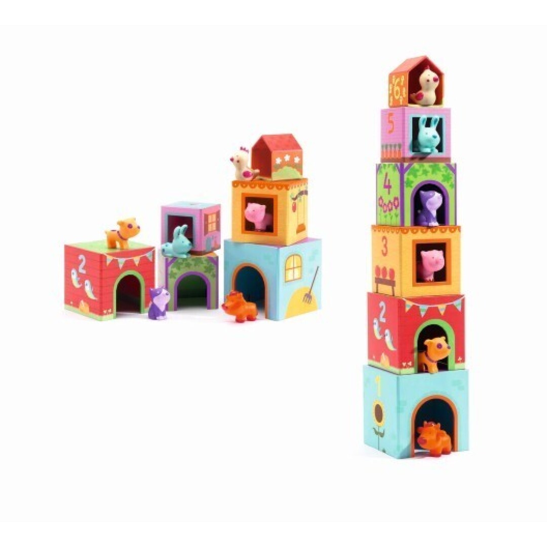 ¡Descubre estos adorables cubos apilables para los más pequeños! Un juguete educativo que combina diversión y aprendizaje con 6 simpáticos animales de granja. Cada cubo, fabricado en cartón resistente, representa una casita única con su propia puertecita.